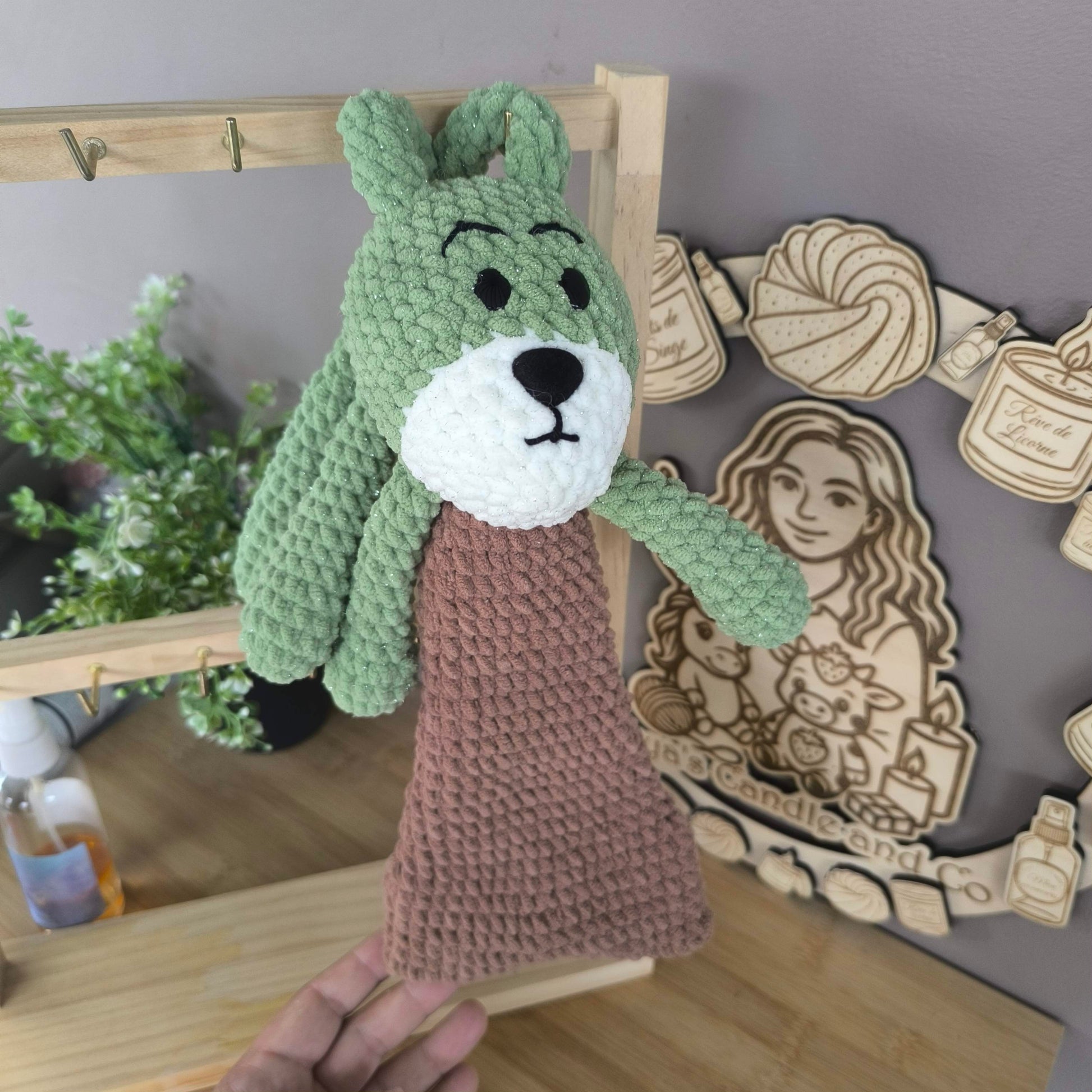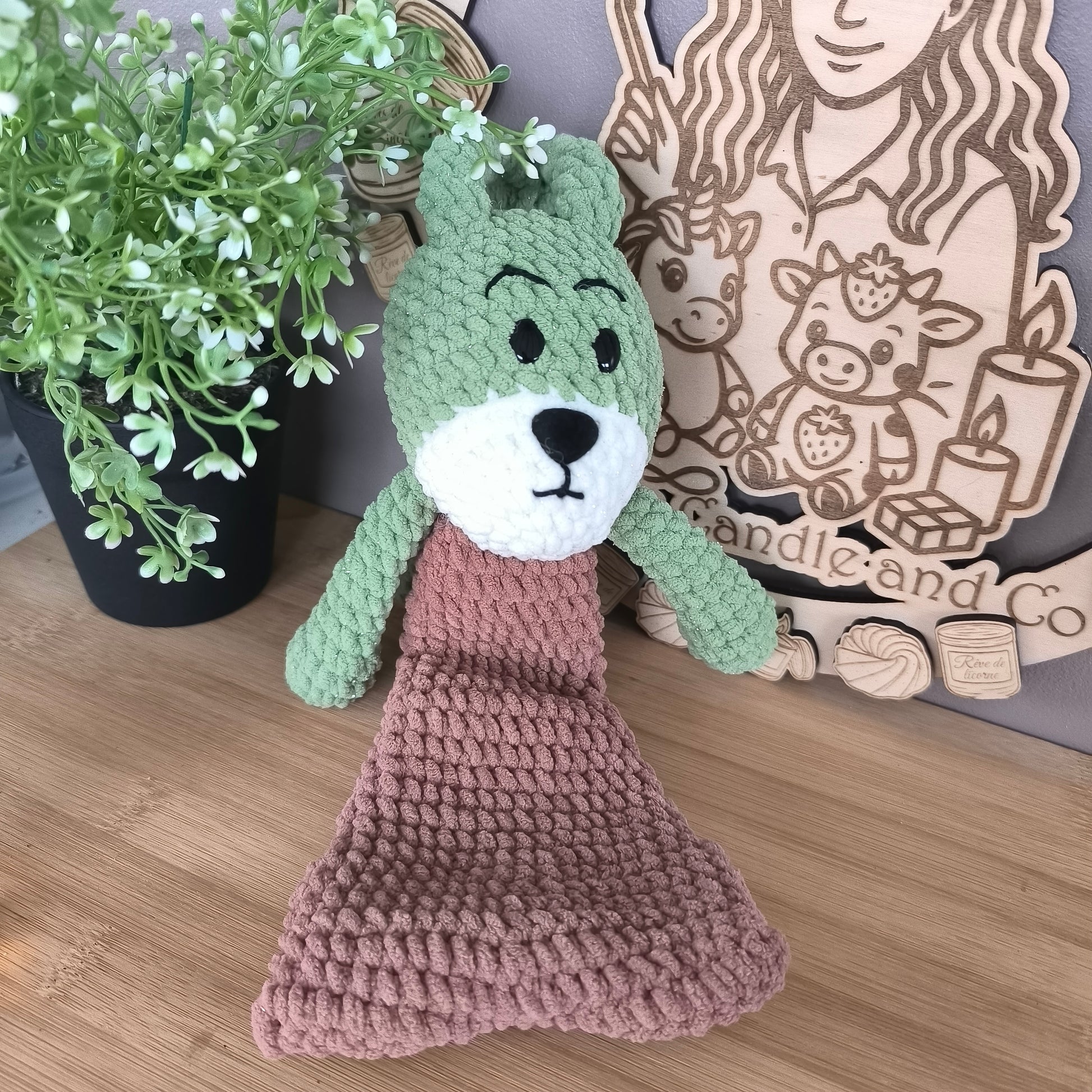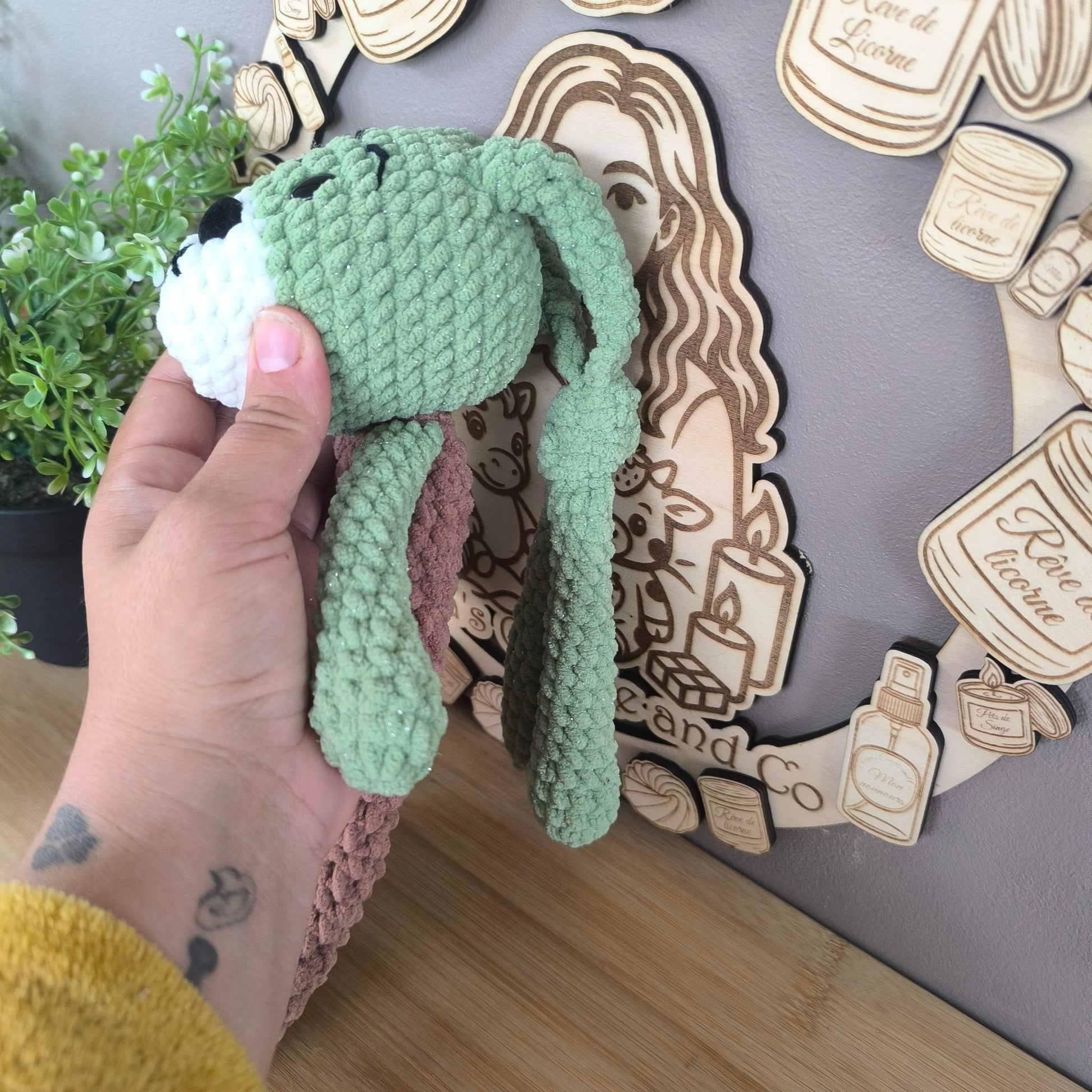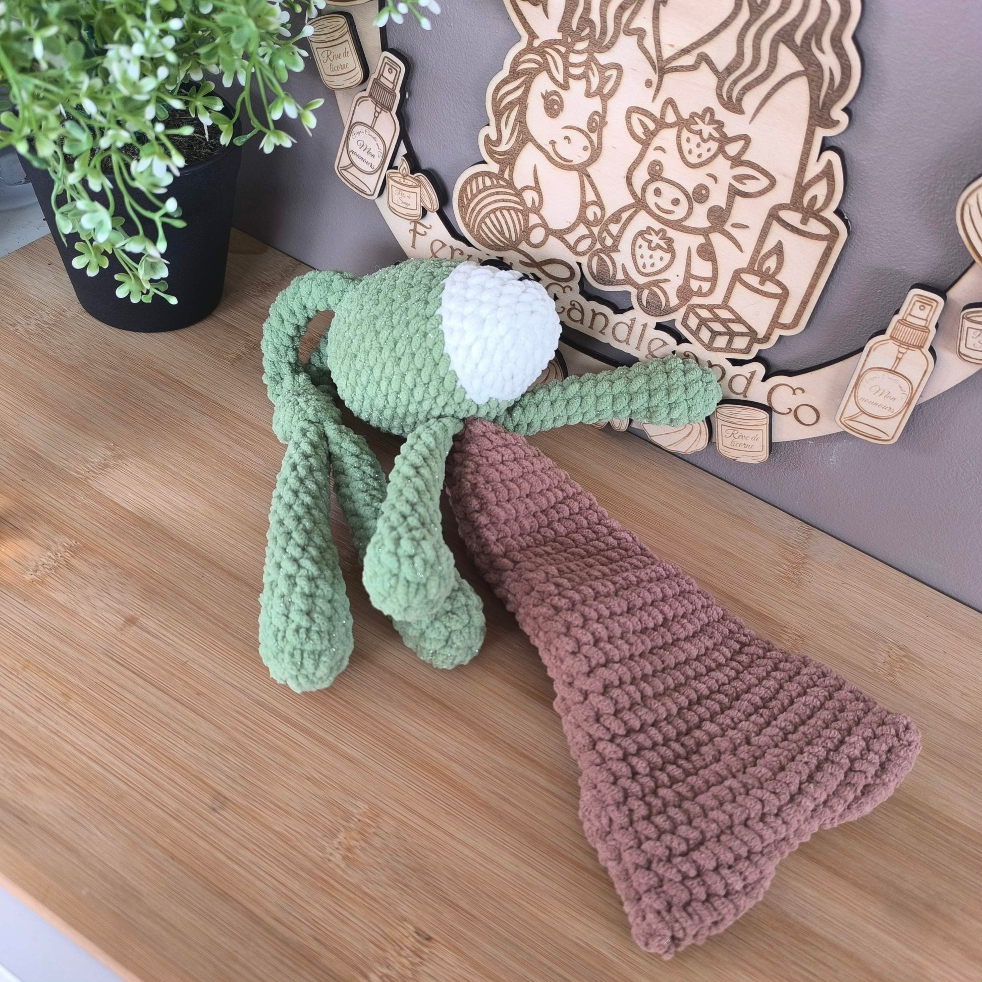 La peluche Peduk arrive bientôt ! Réalisée entièrement à la main en laine chenille douce, avec des touches de laine chenille pailletée pour les parties vertes et blanches ✨.